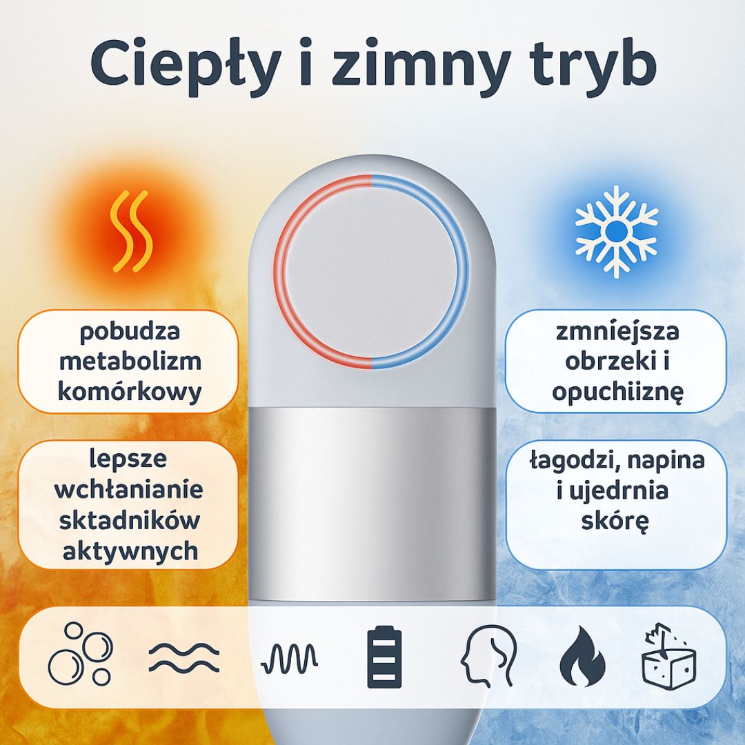 Funkcja ciepła pomaga otwierać pory i przygotować skórę do oczyszczania. Chłodzenie koi skórę, zamyka pory i zmniejsza opuchliznę.